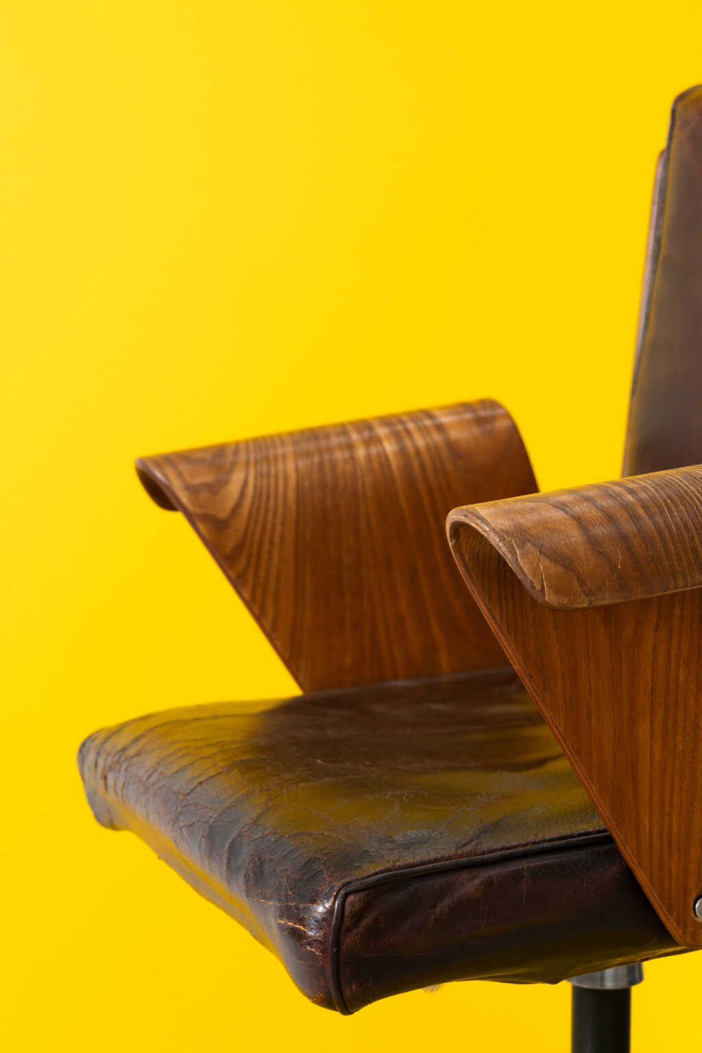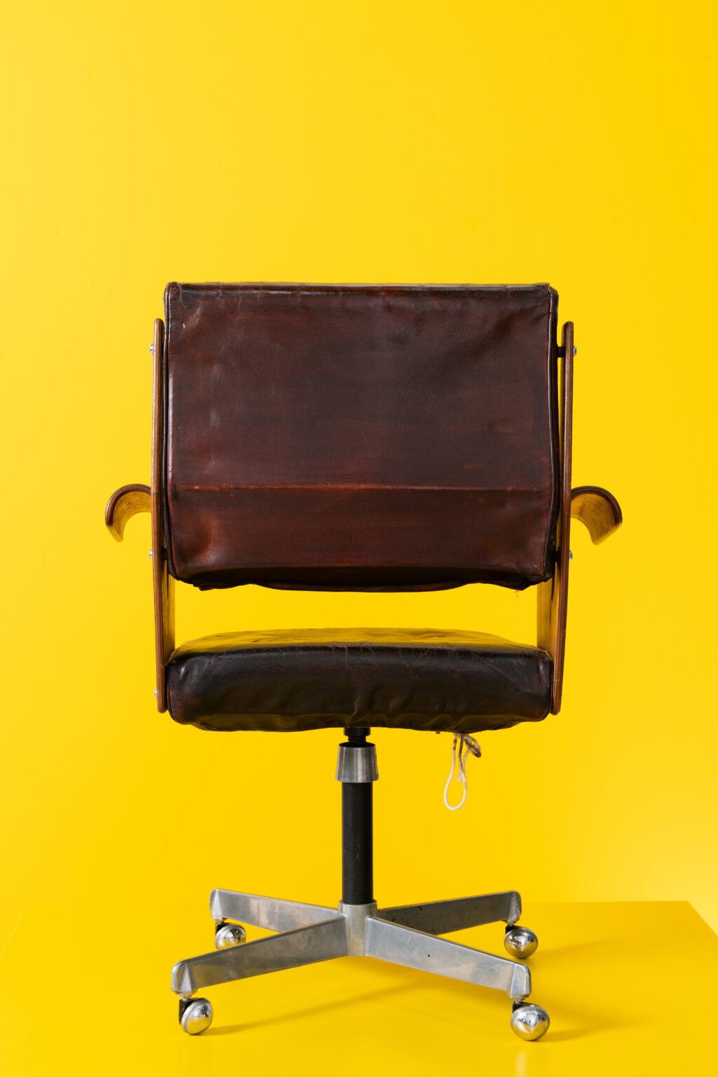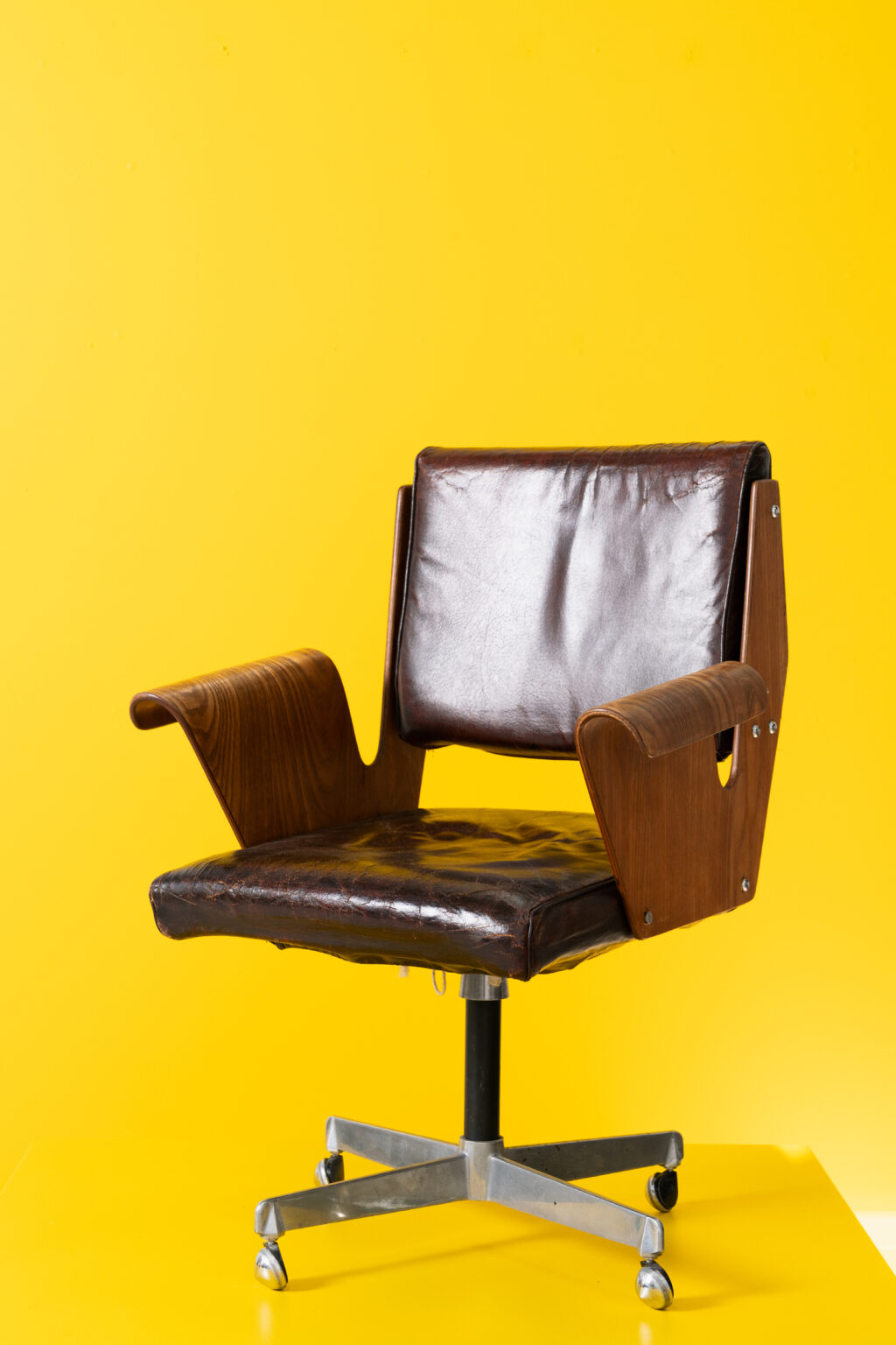 “Albenga” office chair, designed by Gustavo Pulitzer. Rare and fully original, it features height adjustment, reclining, and swivel functions. Its construction is inspired by classic Charles Eames models, with a star-shaped base on casters, leather-covered seat and backrest, connected by wood veneer armrests.