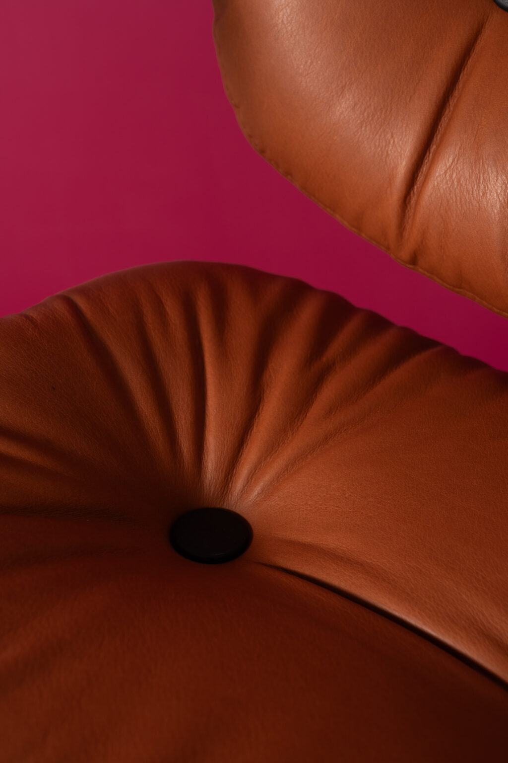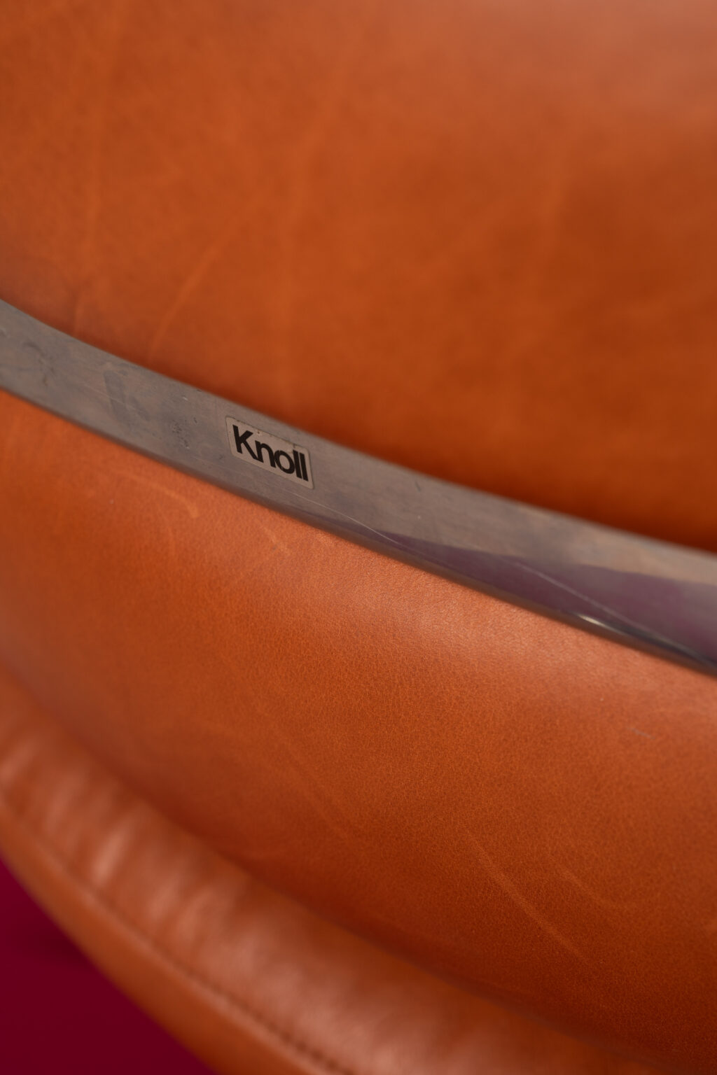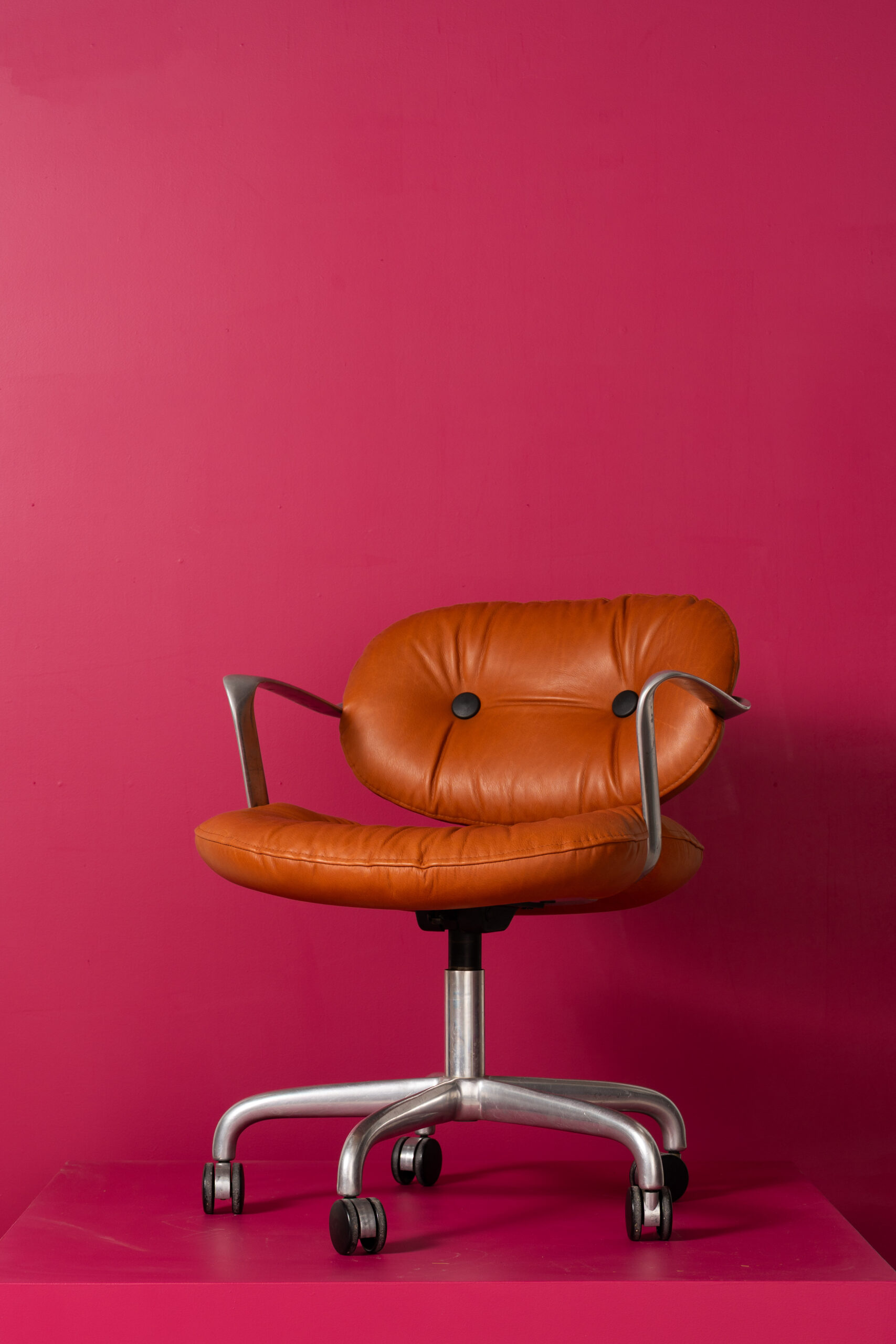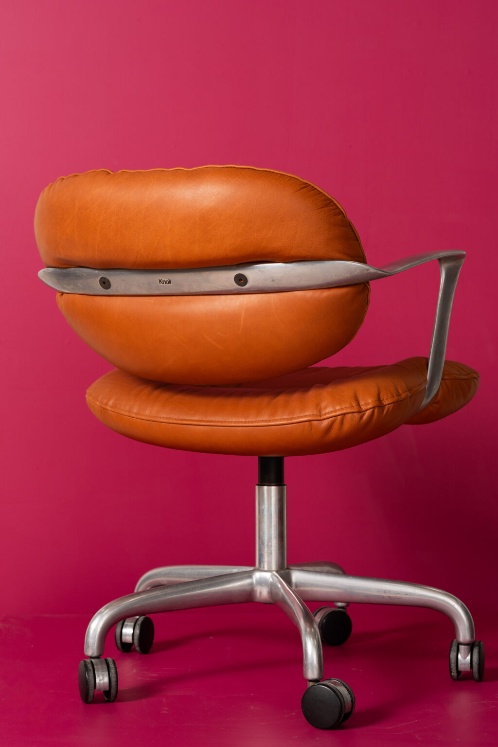 Designed by Hannah Morrison for Knoll in the 1970s, the Model 2328 office chair exemplifies sleek, space-age design with its lightweight aluminum frame. A former collaborator of Charles Eames and lead designer at Bruce Hannah & Associates, Morrison brought a distinctly modern and functional aesthetic to workplace furniture. This piece has been recently reupholstered in light brown leather, enhancing both its comfort and timeless appeal.