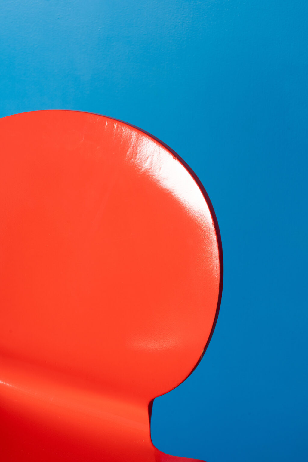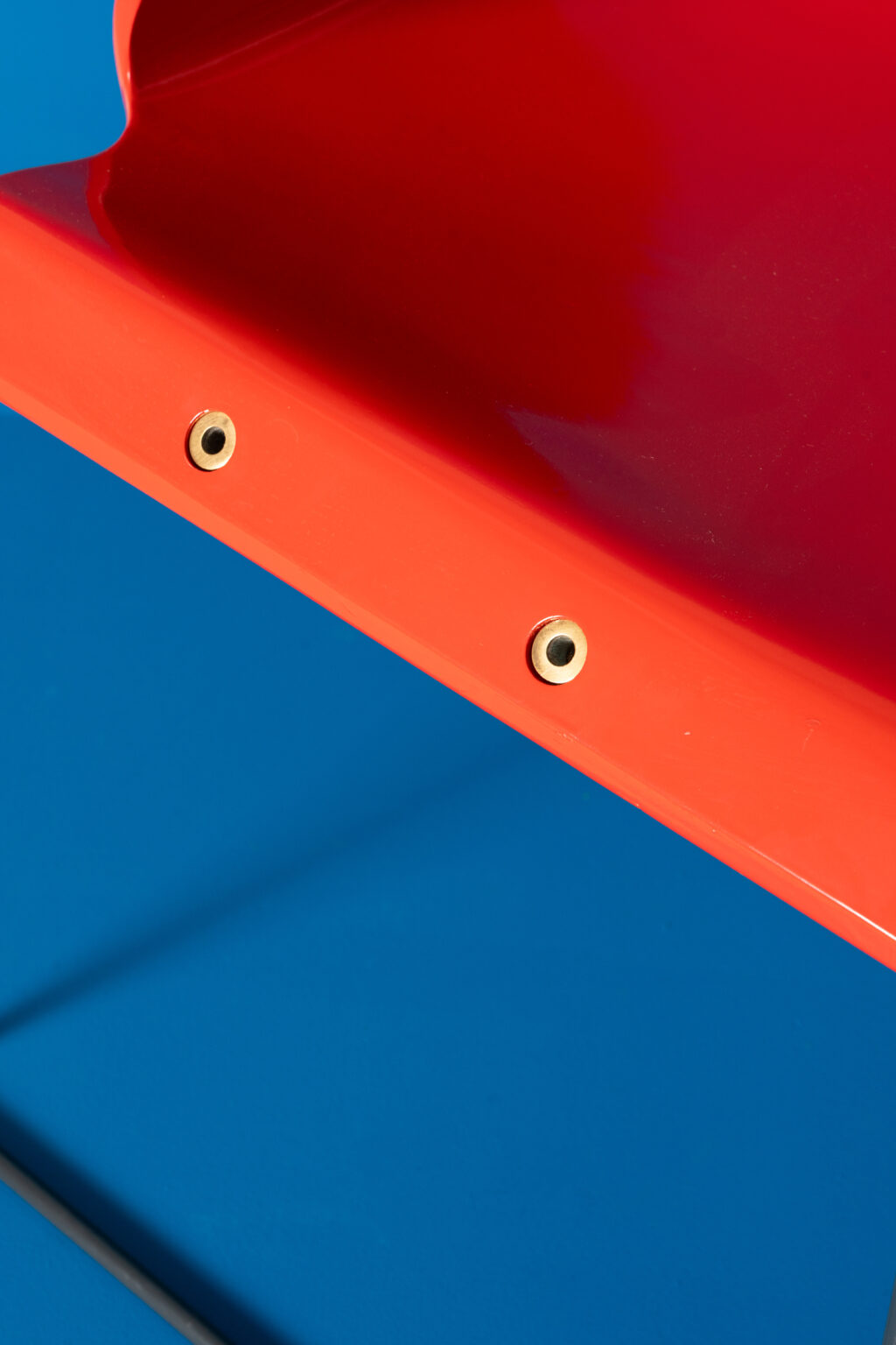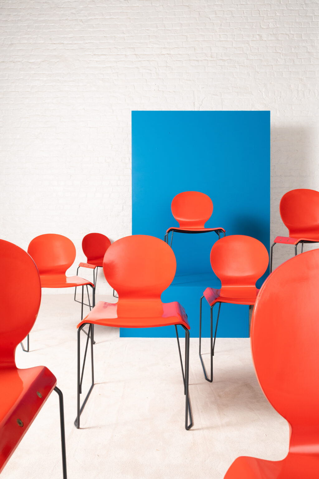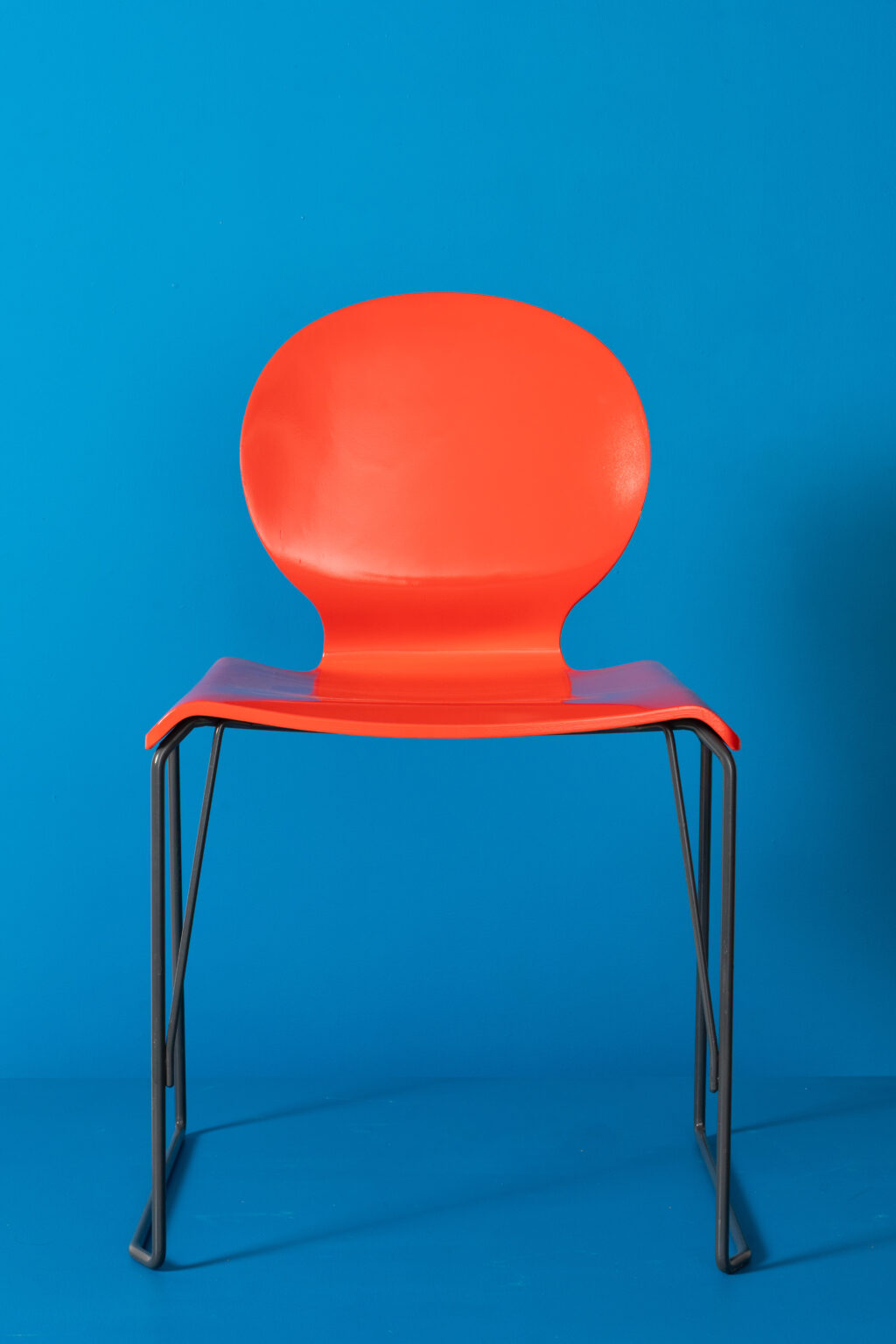 The “Filo” chair, designed by Afra and Tobia Scarpa in 1987, is a single piece of curved ash plywood with a steel rod frame stiffened by tie rods, intended for community or workplace use. This set comes with a red laquer gerating warmth and identity to the design.