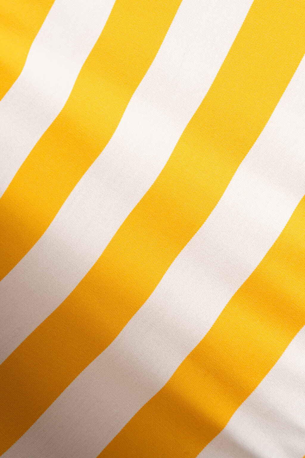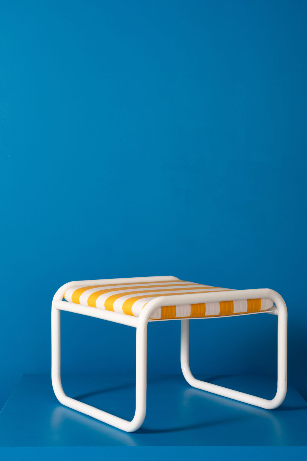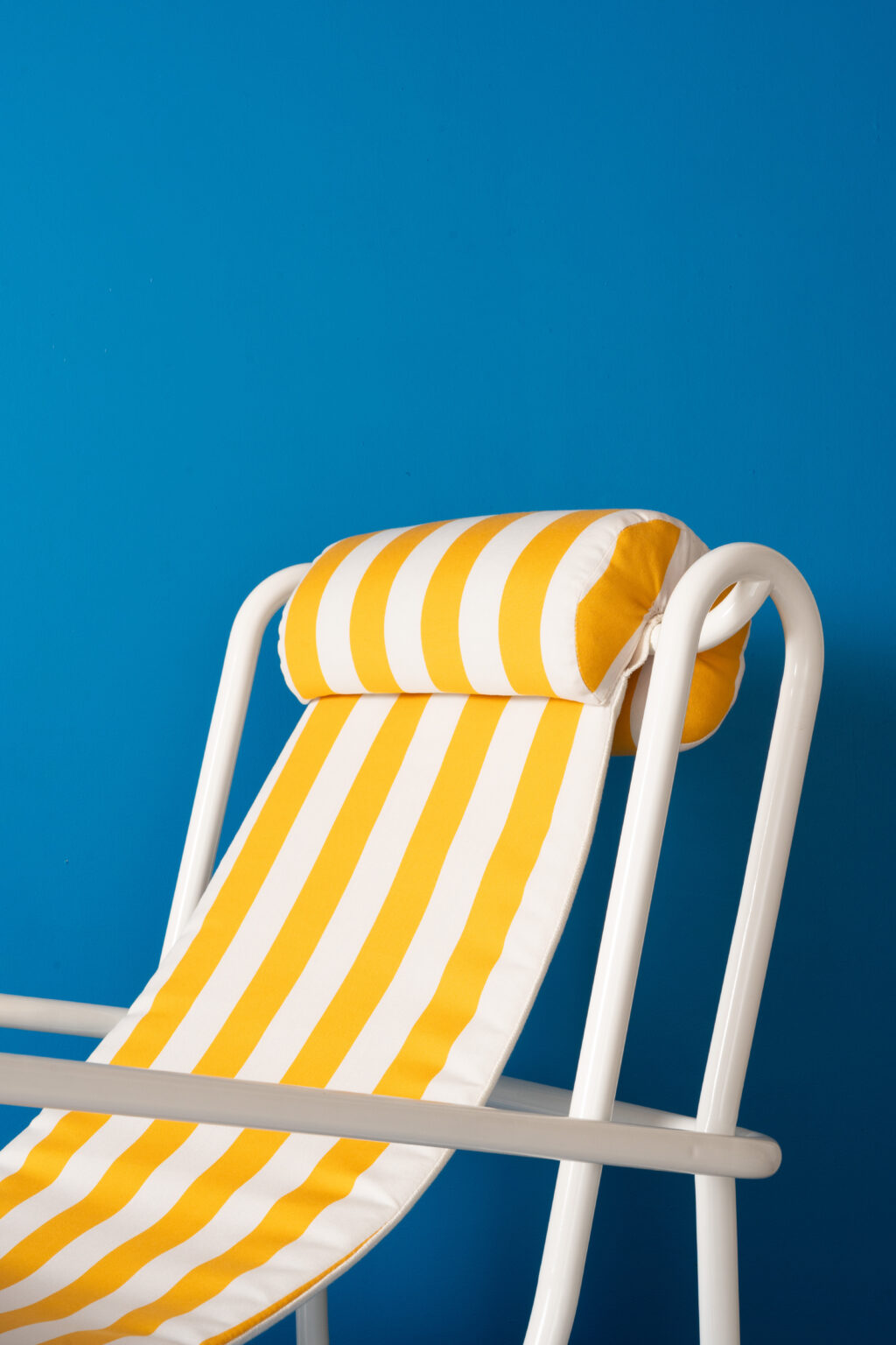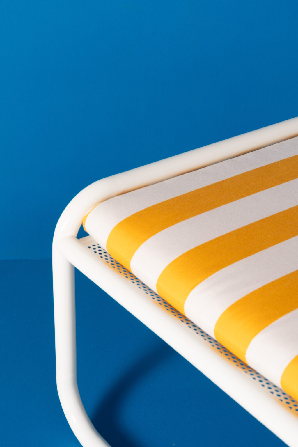 The Locus Solus outdoor armchair, the result of a collaboration between Exteta and Jacquemus, embodies the successful alliance between the timeless design of Gae Aulenti and the contemporary creativity brought by Simon Porte Jacquemus through the creation of the upholstery fabrics: beige and yellow Como stripes. The chair had its tubular steel frame laquered in white by our belgian artisans.