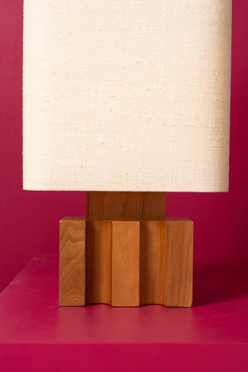 Crafted in the 1960s by Maison Regain, these sculptural table lamps are carved from solid elm wood, showcasing the brand’s signature blend of brutalist and rustic modern aesthetics. The robust, geometric forms highlight the natural grain and warmth of the elm, embodying the timeless appeal of French mid-century design.