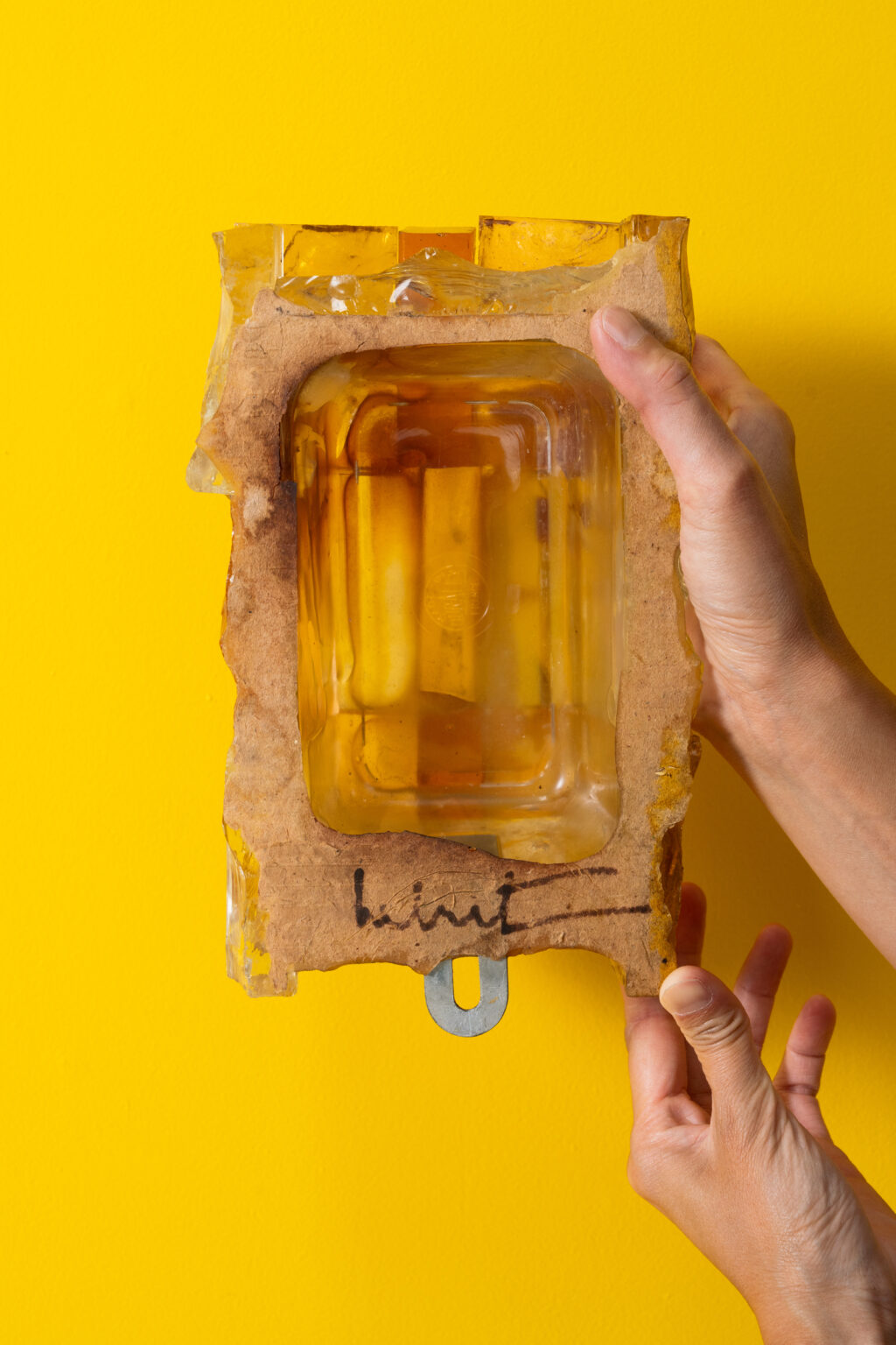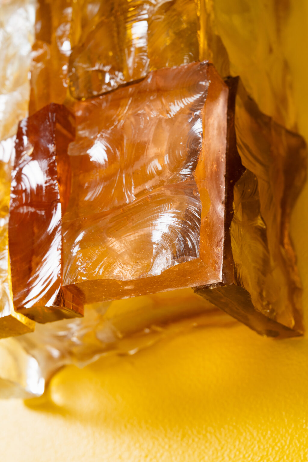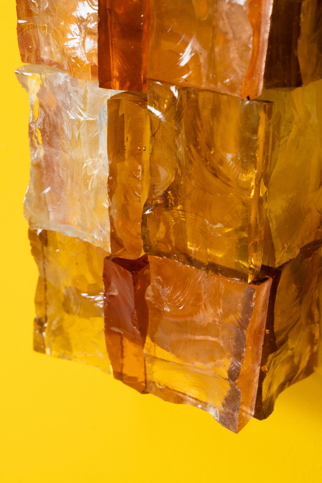 Pair of wall lamps by Lyon-based glassmaker Jean Simon Labret, made circa 1965. Composed of thick hand-cut glass fragments in warm amber, gold and brown tones, arranged on a hollow base. The textured surface creates a sculptural light effect. Signed on the back, with integrated hanging system.