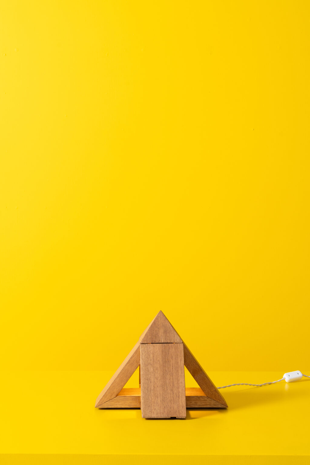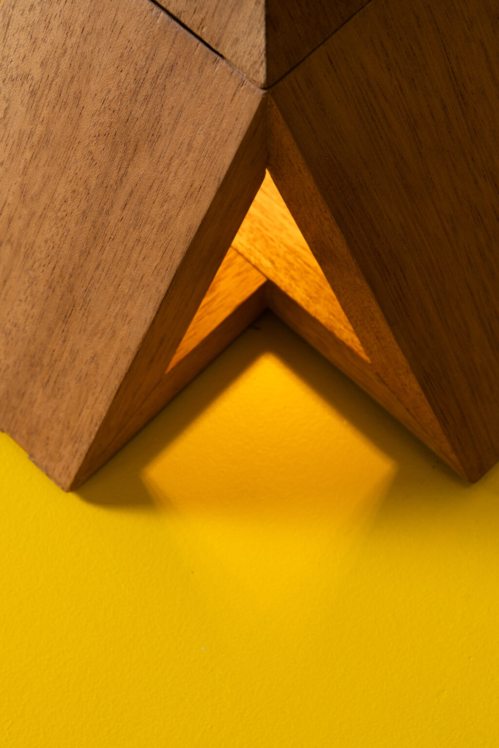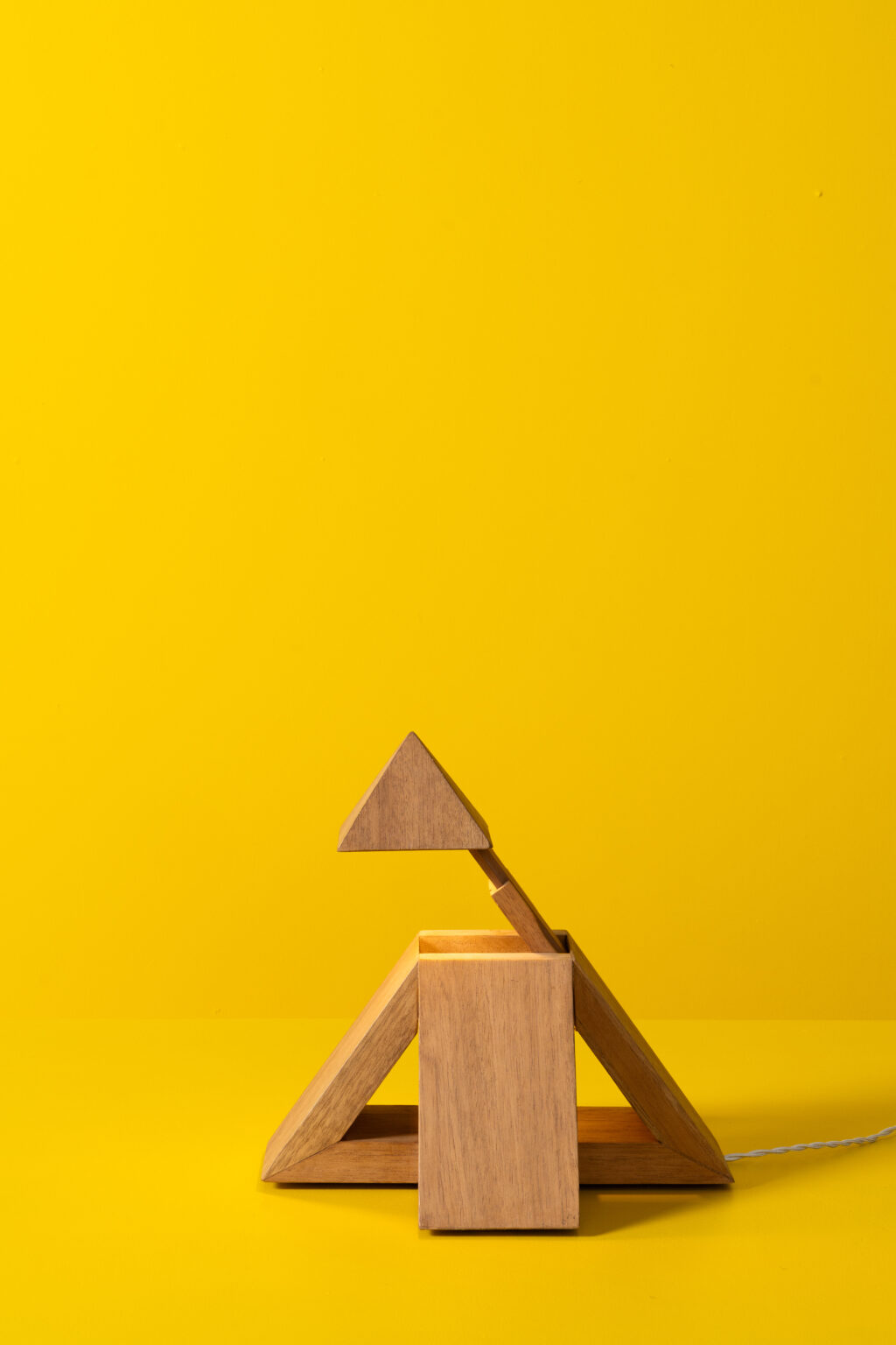 Handcrafted postmodern wooden table lamp. Sculptural geometric shapes with warm, diffused light.