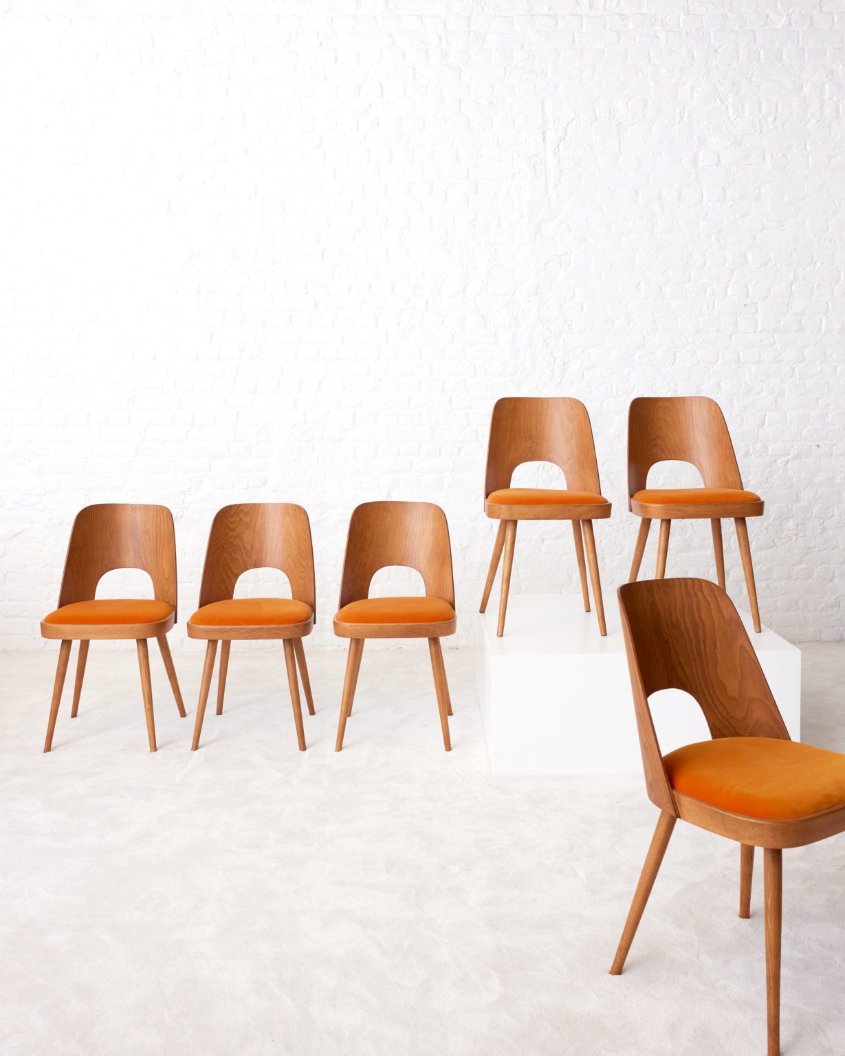 This set of 6 vintage dining chairs was designed in Czech Republic in the 1950s by Oswald Haerdtl, famous Austrian designer. Together with Mr. Josef Hoffmann he designed the cafe terrace at the Vienna Werkbund Exhibition of 1930, where they designed every little detail from interiors to even cutlery. The chairs are very light in form and comfortable in use, reupholstered in high-quality fabric.