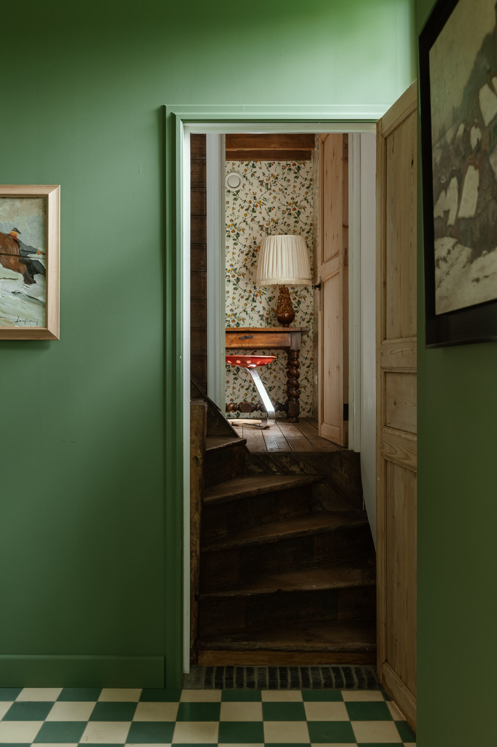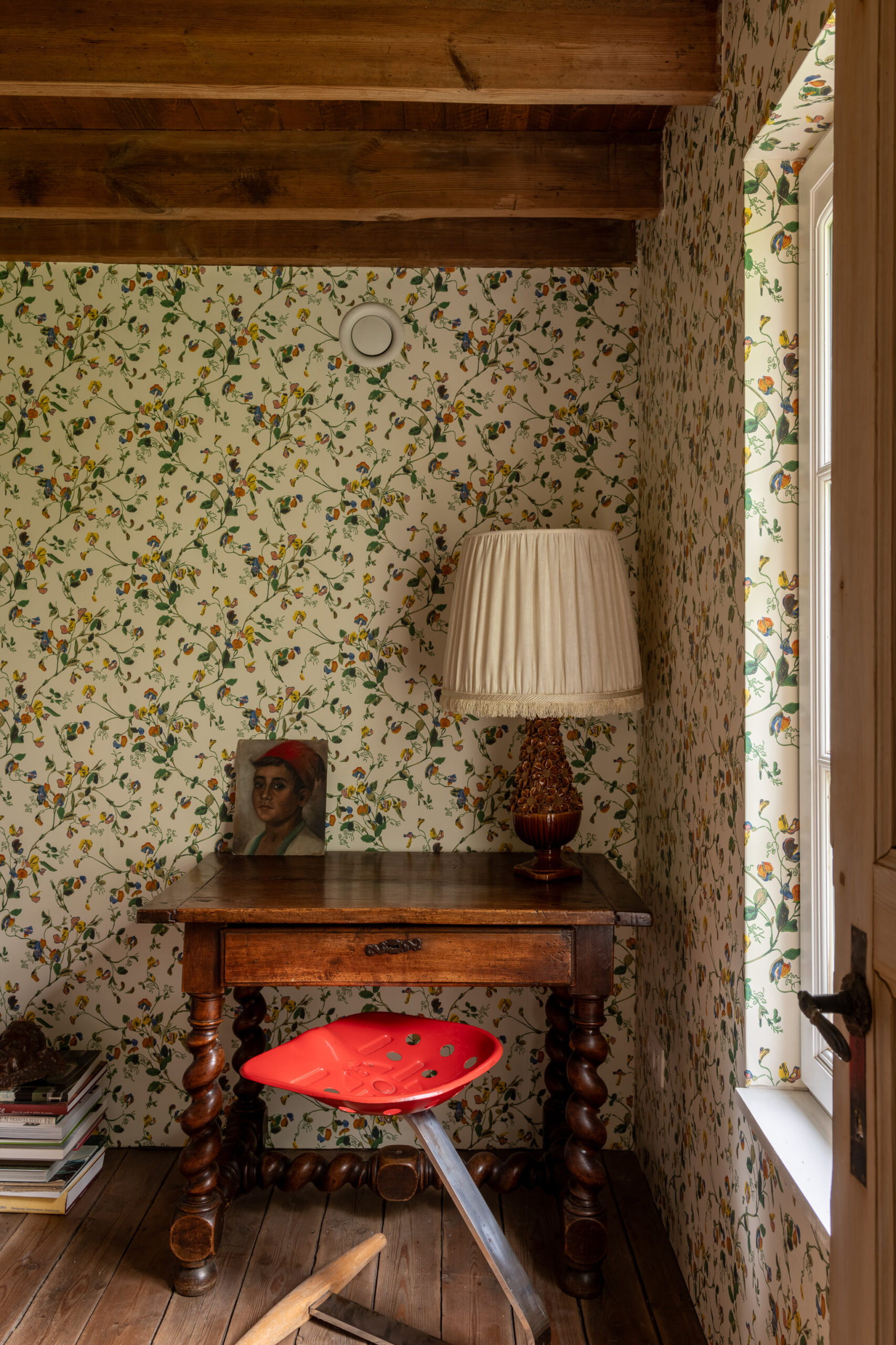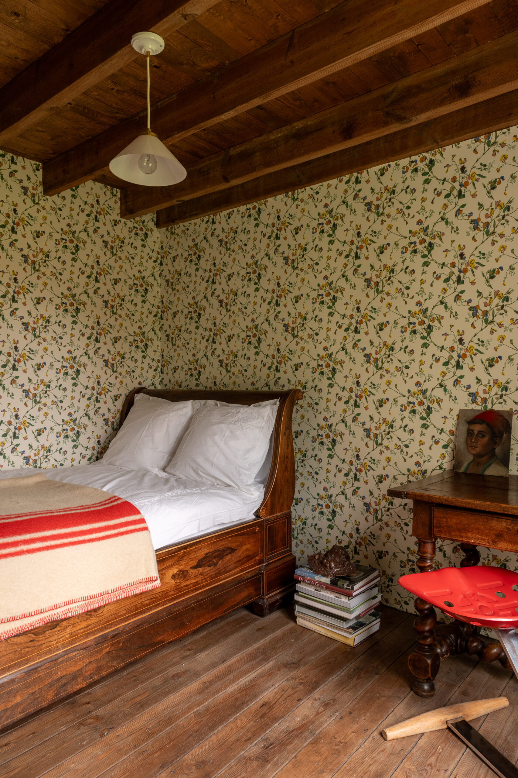 The approach extended beyond preservation, curating the spatial flow and atmosphere through careful details. The original tiles, a green sink inherited from the owner’s grandmother, a floral fabric sourced from an Austrian market, and a bright red Mezzadro stool by Castiglioni serve as anchor points in a colorful composition that bridges the home’s history with a fresh, lived-in character.